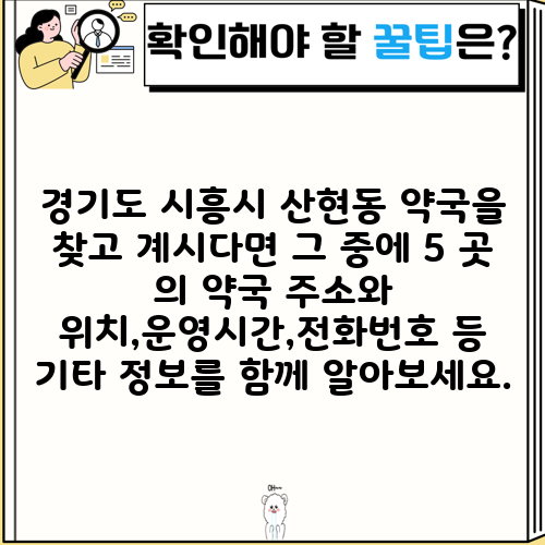 경기도 시흥시 산현동 약국을 찾고 계시다면 그 중에 5 곳 의 약국 주소와 위치,운영시간,전화번호 등 기타 정보를 함께 알아보세요.