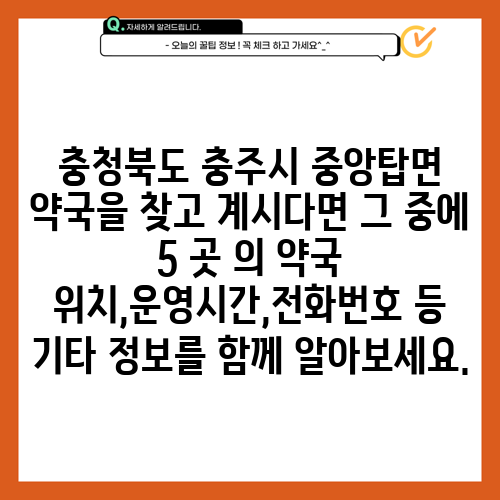 충청북도 충주시 중앙탑면 약국을 찾고 계시다면 그 중에 5 곳 의 약국 위치,운영시간,전화번호 등 기타 정보를 함께 알아보세요.
