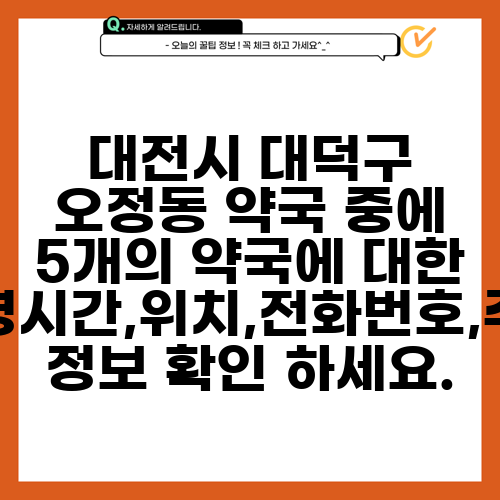 대전시 대덕구 오정동 약국 중에 5개의 약국에 대한 운영시간,위치,전화번호,주소 정보 확인 하세요.