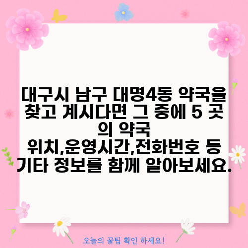 대구시 남구 대명4동 약국을 찾고 계시다면 그 중에 5 곳 의 약국 위치,운영시간,전화번호 등 기타 정보를 함께 알아보세요.