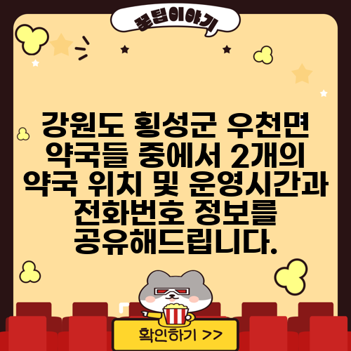 강원도 횡성군 우천면 약국들 중에서 2개의 약국 위치 및 운영시간과 전화번호 정보를 공유해드립니다.