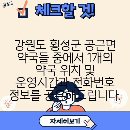 강원도 횡성군 공근면 약국들 중에서 1개의 약국 위치 및 운영시간과 전화번호 정보를 공유해드립니다.