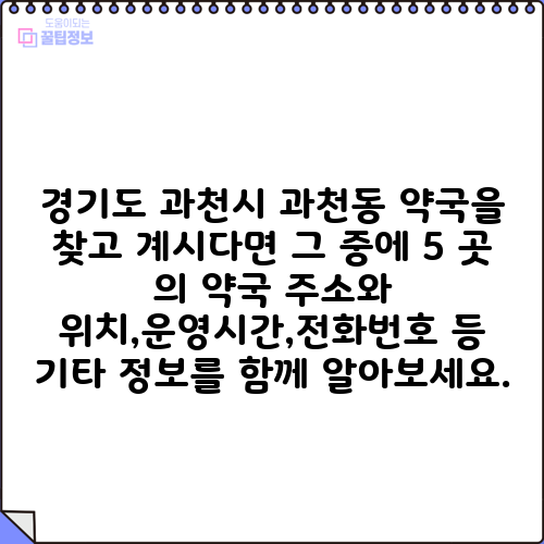 경기도 과천시 과천동 약국을 찾고 계시다면 그 중에 5 곳 의 약국 주소와 위치,운영시간,전화번호 등 기타 정보를 함께 알아보세요.