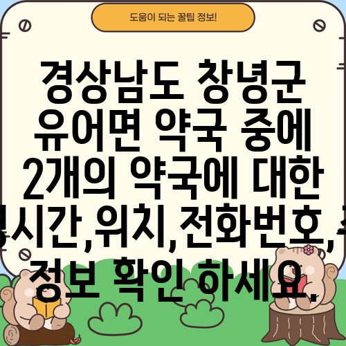 경상남도 창녕군 유어면 약국 중에 2개의 약국에 대한 운영시간,위치,전화번호,주소 정보 확인 하세요.