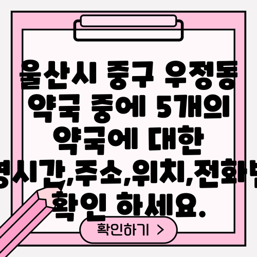울산시 중구 우정동 약국 중에 5개의 약국에 대한 운영시간,주소,위치,전화번호 확인 하세요.