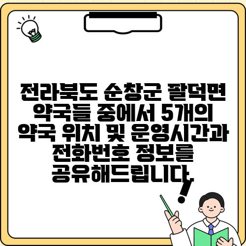 전라북도 순창군 팔덕면 약국들 중에서 5개의 약국 위치 및 운영시간과 전화번호 정보를 공유해드립니다.