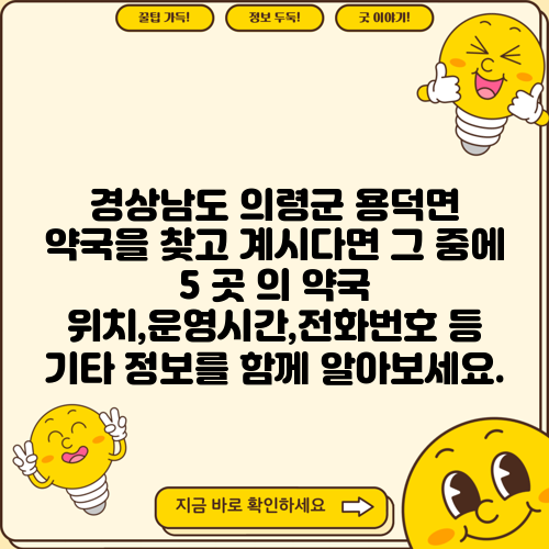 경상남도 의령군 용덕면 약국을 찾고 계시다면 그 중에 5 곳 의 약국 위치,운영시간,전화번호 등 기타 정보를 함께 알아보세요.