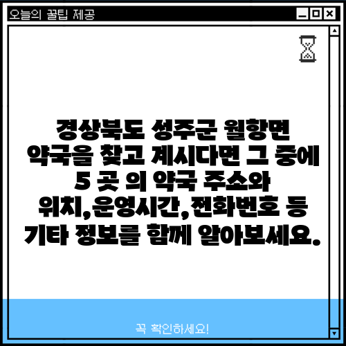 경상북도 성주군 월항면 약국을 찾고 계시다면 그 중에 5 곳 의 약국 주소와 위치,운영시간,전화번호 등 기타 정보를 함께 알아보세요.