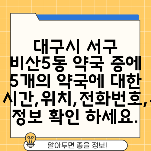 대구시 서구 비산5동 약국 중에 5개의 약국에 대한 운영시간,위치,전화번호,주소 정보 확인 하세요.