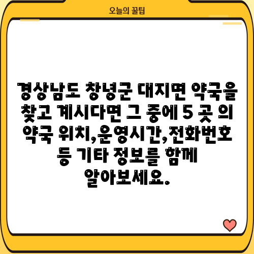 경상남도 창녕군 대지면 약국을 찾고 계시다면 그 중에 5 곳 의 약국 위치,운영시간,전화번호 등 기타 정보를 함께 알아보세요.