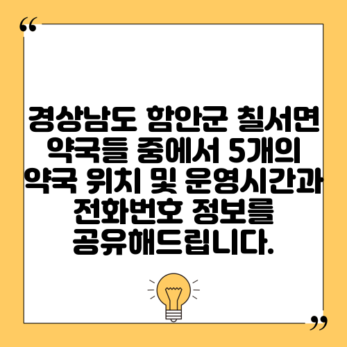경상남도 함안군 칠서면 약국들 중에서 5개의 약국 위치 및 운영시간과 전화번호 정보를 공유해드립니다.
