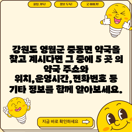 강원도 영월군 중동면 약국을 찾고 계시다면 그 중에 5 곳 의 약국 주소와 위치,운영시간,전화번호 등 기타 정보를 함께 알아보세요.