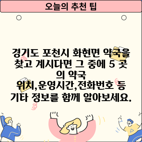 경기도 포천시 화현면 약국을 찾고 계시다면 그 중에 5 곳 의 약국 위치,운영시간,전화번호 등 기타 정보를 함께 알아보세요.