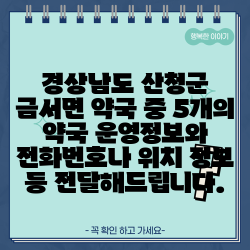 경상남도 산청군 금서면 약국 중 5개의 약국 운영정보와 전화번호나 위치 정보 등 전달해드립니다.