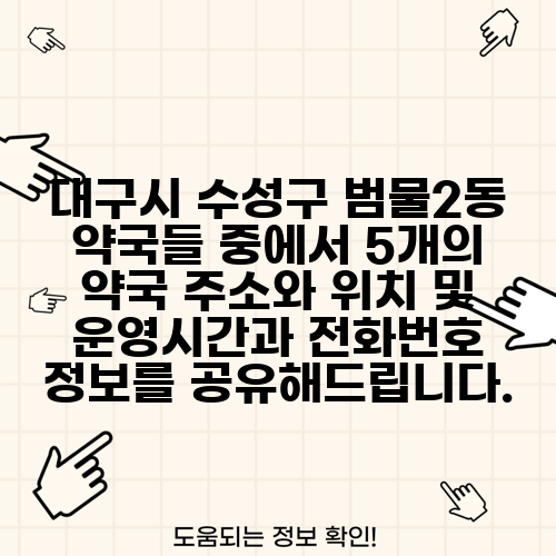대구시 수성구 범물2동 약국들 중에서 5개의 약국 주소와 위치 및 운영시간과 전화번호 정보를 공유해드립니다.