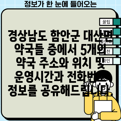 경상남도 함안군 대산면 약국들 중에서 5개의 약국 주소와 위치 및 운영시간과 전화번호 정보를 공유해드립니다.