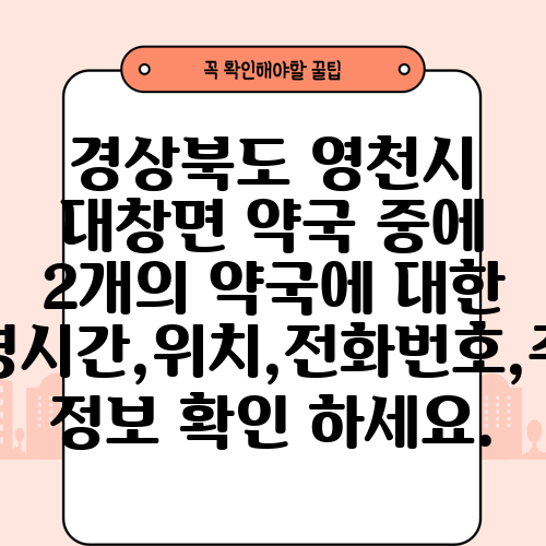 경상북도 영천시 대창면 약국 중에 2개의 약국에 대한 운영시간,위치,전화번호,주소 정보 확인 하세요.
