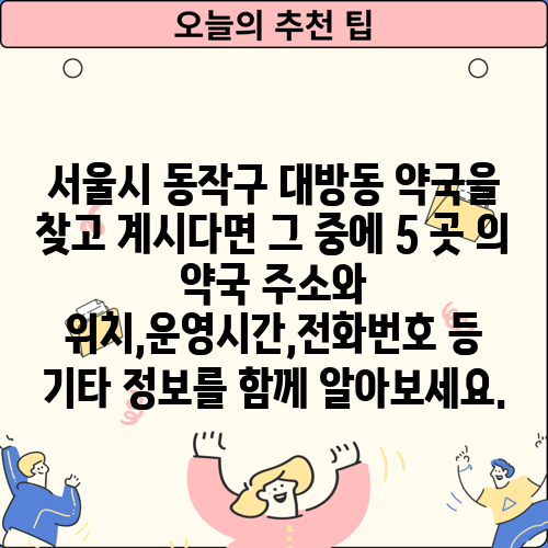 서울시 동작구 대방동 약국을 찾고 계시다면 그 중에 5 곳 의 약국 주소와 위치,운영시간,전화번호 등 기타 정보를 함께 알아보세요.
