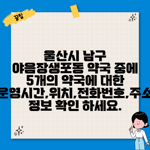 울산시 남구 야음장생포동 약국 중에 5개의 약국에 대한 운영시간,위치,전화번호,주소 정보 확인 하세요.