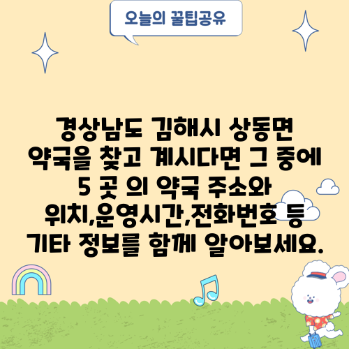 경상남도 김해시 상동면 약국을 찾고 계시다면 그 중에 5 곳 의 약국 주소와 위치,운영시간,전화번호 등 기타 정보를 함께 알아보세요.