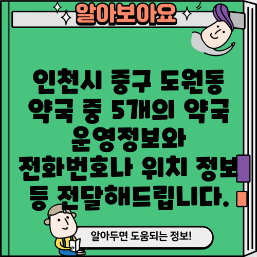 인천시 중구 도원동 약국 중 5개의 약국 운영정보와 전화번호나 위치 정보 등 전달해드립니다.