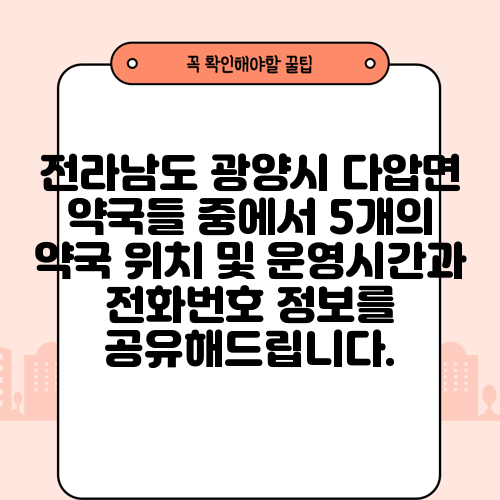 전라남도 광양시 다압면 약국들 중에서 5개의 약국 위치 및 운영시간과 전화번호 정보를 공유해드립니다.