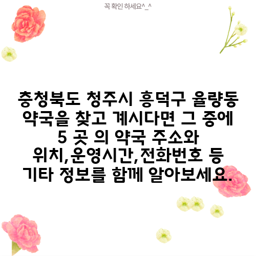 충청북도 청주시 흥덕구 율량동 약국을 찾고 계시다면 그 중에 5 곳 의 약국 주소와 위치,운영시간,전화번호 등 기타 정보를 함께 알아보세요.