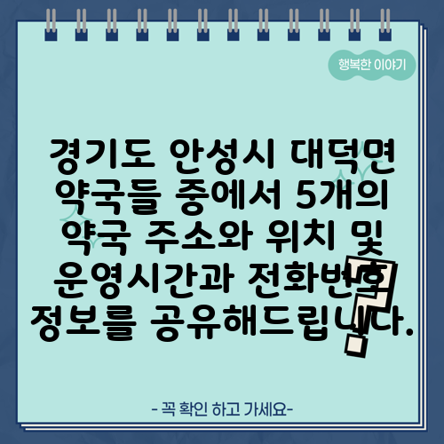 경기도 안성시 대덕면 약국들 중에서 5개의 약국 주소와 위치 및 운영시간과 전화번호 정보를 공유해드립니다.