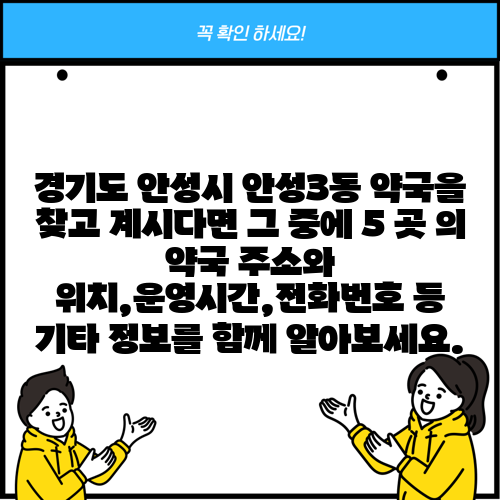 경기도 안성시 안성3동 약국을 찾고 계시다면 그 중에 5 곳 의 약국 주소와 위치,운영시간,전화번호 등 기타 정보를 함께 알아보세요.