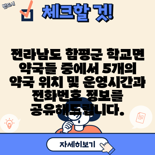 전라남도 함평군 학교면 약국들 중에서 5개의 약국 위치 및 운영시간과 전화번호 정보를 공유해드립니다.