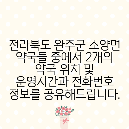 전라북도 완주군 소양면 약국들 중에서 2개의 약국 위치 및 운영시간과 전화번호 정보를 공유해드립니다.